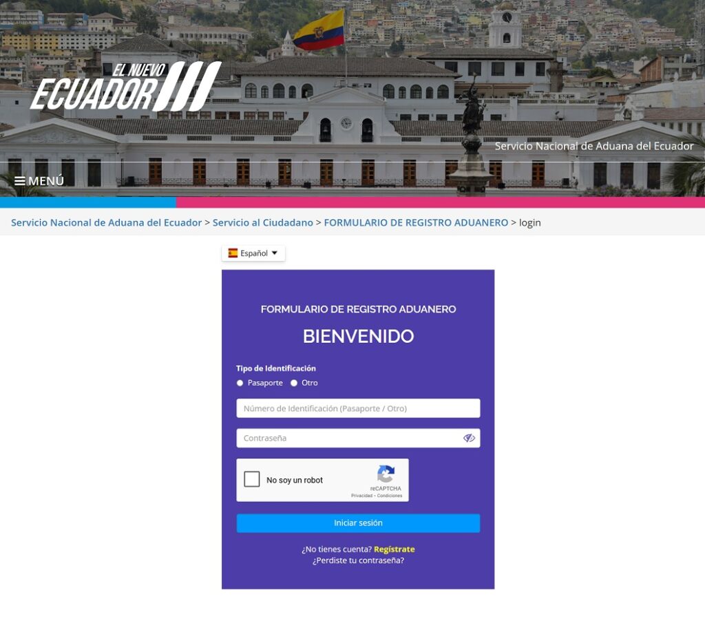 Servicio Nacional de Aduana del Ecuador. (17 de Julio de 2025). FORMULARIO DE REGISTRO ADUANERO. Obtenido de https://www.aduana.gob.ec/servicio-al-ciudadano/formulario-de-registro-aduanero/login/
