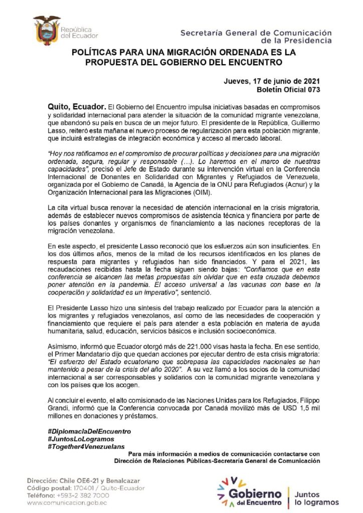 El presente jueves 17 de junio de 2021 a través del Boletín Oficial 073 se da conocer sobre nuevas políticas para una migración ordenada en este gobierno del encuentro. En donde se ratifica el compromiso de procurar políticas y decisiones para una migración ordenada, segura, regular y responsable. Esto bajo afirmaciones del Jefe de estado Guillermo Lasso en la Conferencia Internacional de Donante en Solidaridad con Migrantes y Refugiados de Venezuela, organizada por: Canadá la Agencia de la ONU para Refugiados (Acnur) y la Organización Internacional para las Migraciones (OIM).