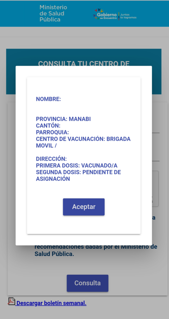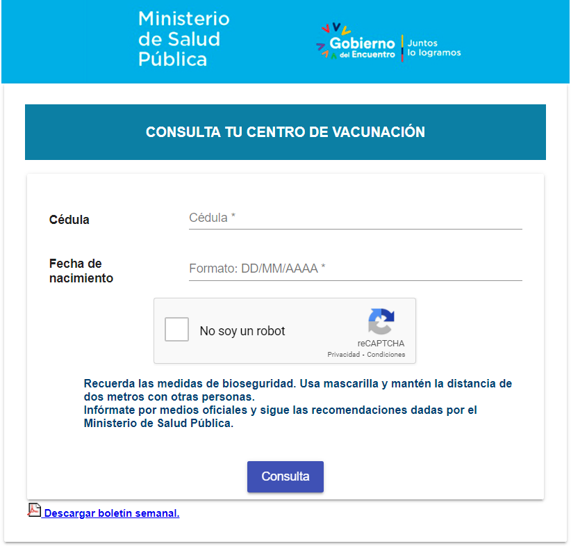 Ministerio de Salud Pública del Ecuador: Consulta tu centro de vacunación. Disponible en: https://lugarvacunacion.cne.gob.ec/