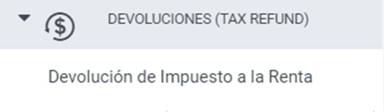 En el menú lateral izquierda buscamos lo siguiente, “Devoluciones (Tax Refund)” seguido por “Devolución de Impuesto a la Renta”.